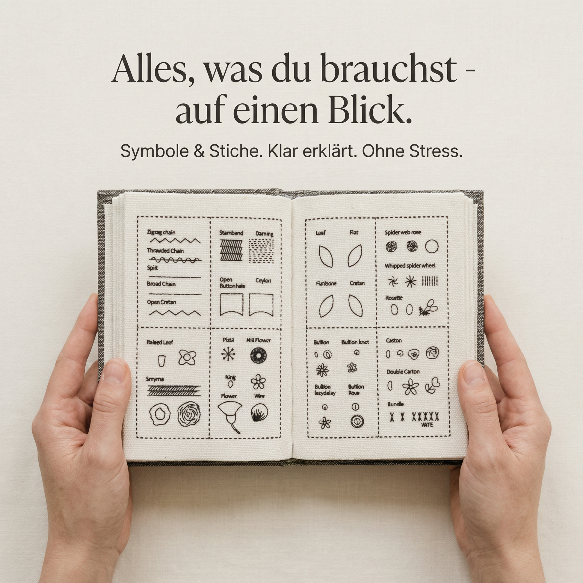 Du beginnst mit einfachen Stichen und wirst sanft zu immer schöneren, detailreicheren Motiven geführt ganz ohne Druck, ganz ohne Vorkenntnisse.